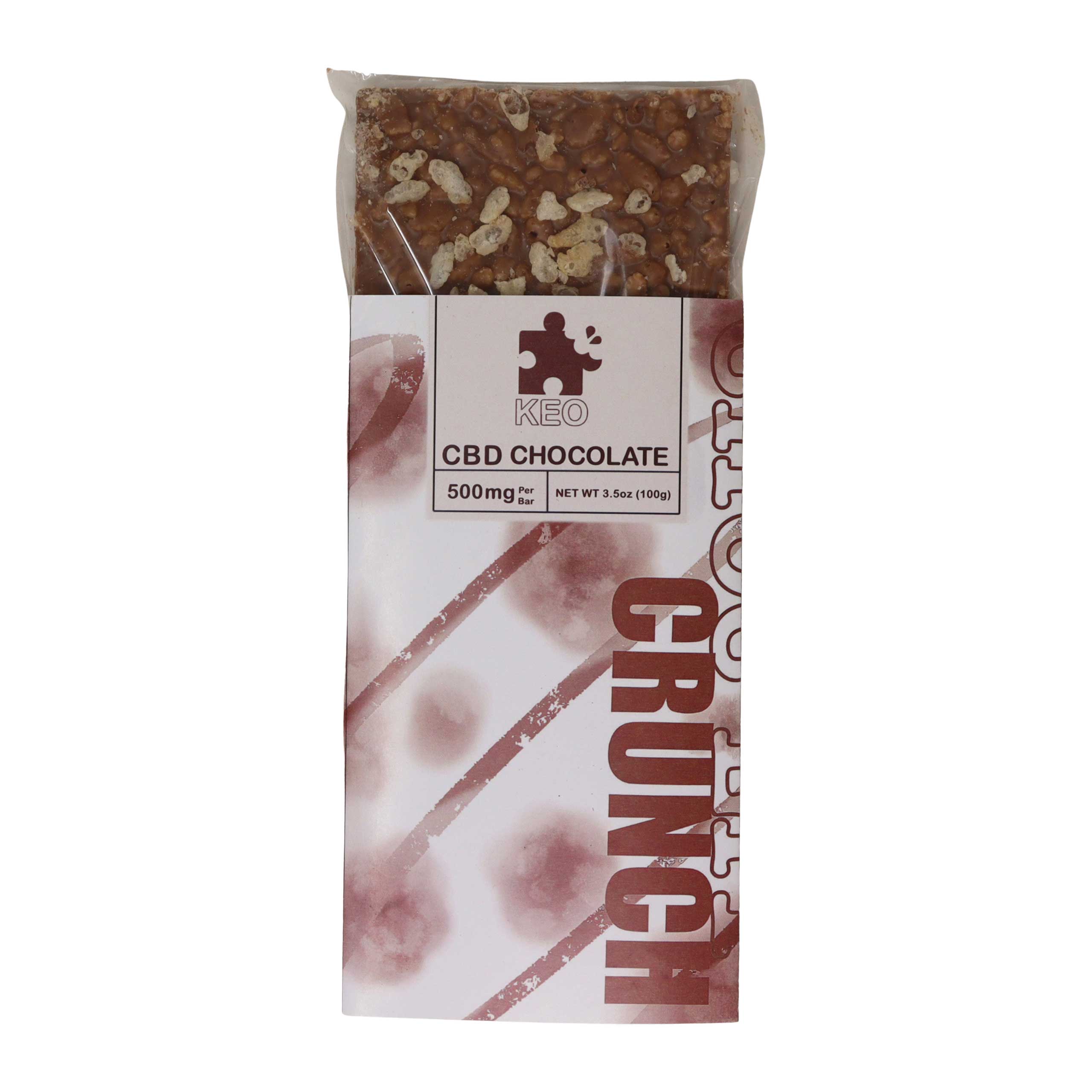 Choc’lit Crunch milk chocolate by Keo Edibles. Snap, Crackle, ChillCrispy rice meets smooth chocolate and soothing CBD for a nostalgic crunch with a calming twist.